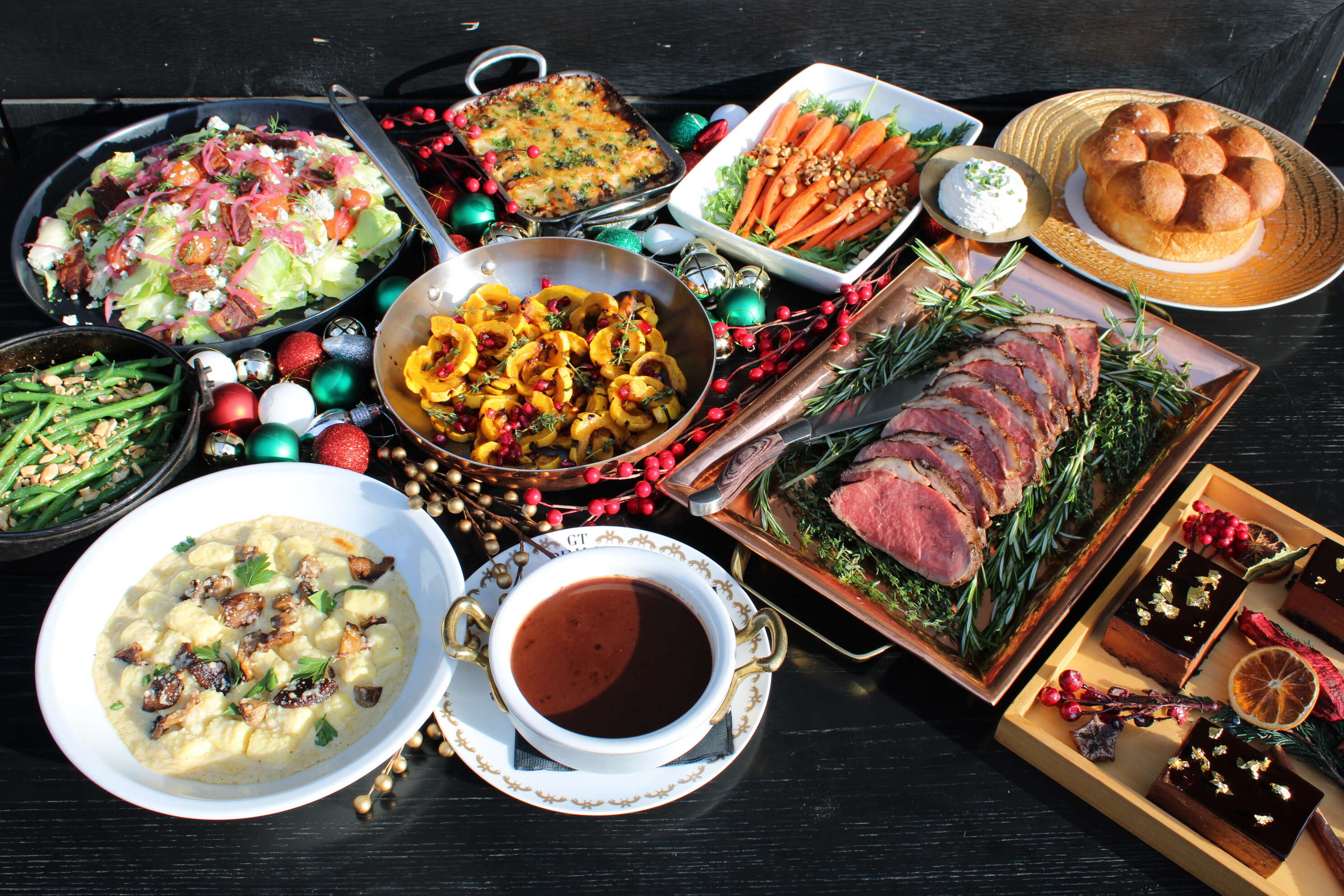 Feast on wood-oven roasted pork shank seasonal winter sides and festive holiday desserts.